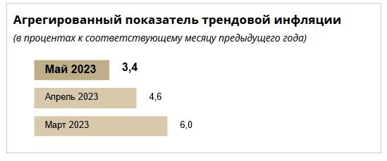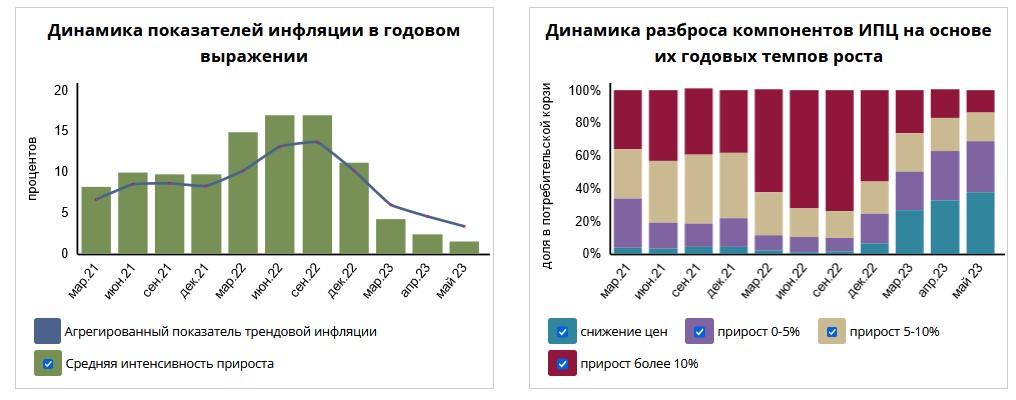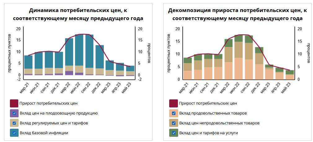 Относительно апреля 2023 г. в мае наблюдалось снижение потребительских цен на 0,3%.