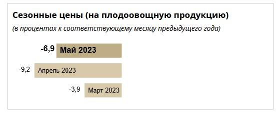Сезонные цены на плодоовощную продукцию снизились ( –6,9% к соответствующему месяцу 2022 года). –9,2% было в апреле и -3,9% – в марте.