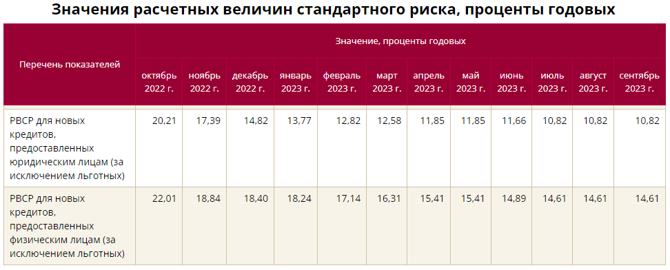 Расчетная величина стандартного риска по новым кредитам в национальной валюте, предоставленным юридическим лицам (за исключением льготных), сохранена на уровне 10,82% годовых.