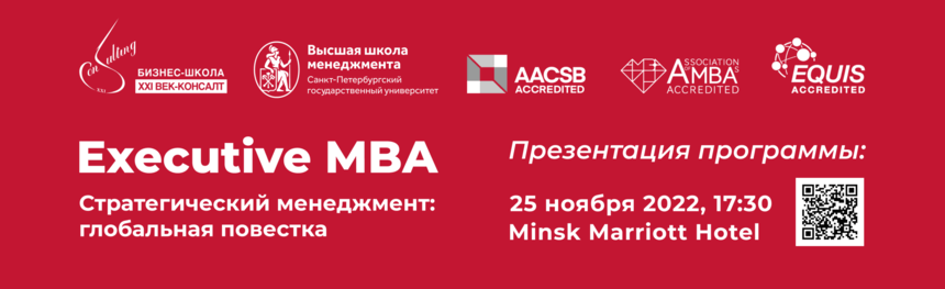 25 ноября 2022 года ждем руководителей и собственников компаний на презентации совместной программы Executive MBA БИЗНЕС-ШКОЛЫ XXI ВЕК-КОНСАЛТ и Высшей школой менеджмента Санкт-Петербургского государственного университета. На мероприятии выступят академические директора, профессора, выпускники и слушатели программы и расскажут, как проходят занятия, какие дисциплины, бизнес-симуляции, форсайт-сессии, гостевые лекции и мастер-классы включены в обучение, какие уникальные опции есть у образовательного проекта двух ведущих бизнес-школ. Также участники мероприятия узнают, какие требования предъявляются к абитуриентам и как поступить на обучение.