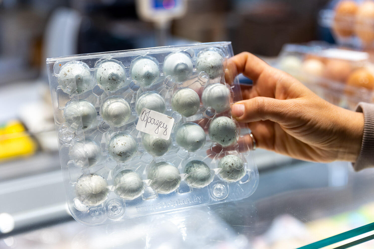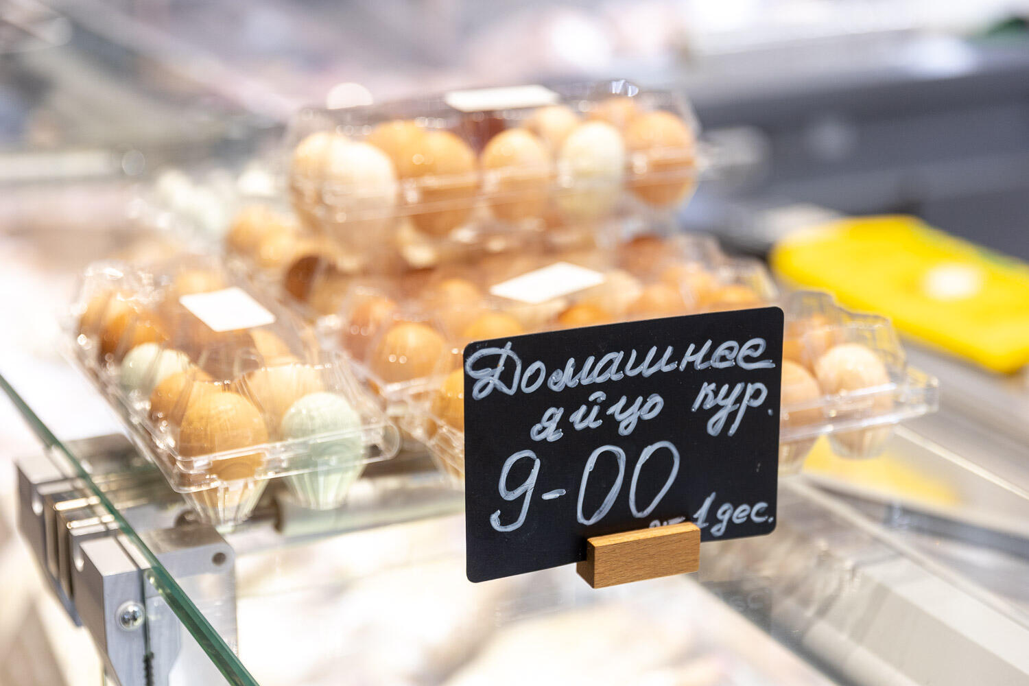 Первая точка, где с нами соглашаются поговорить, – это прилавки с домашней птицей и яйцами. Уточняем, что здесь хит продаж. Нам поясняют: домашние яйца. Владелица точки говорит, что такие яйца, как здесь, есть не на каждом рынке.