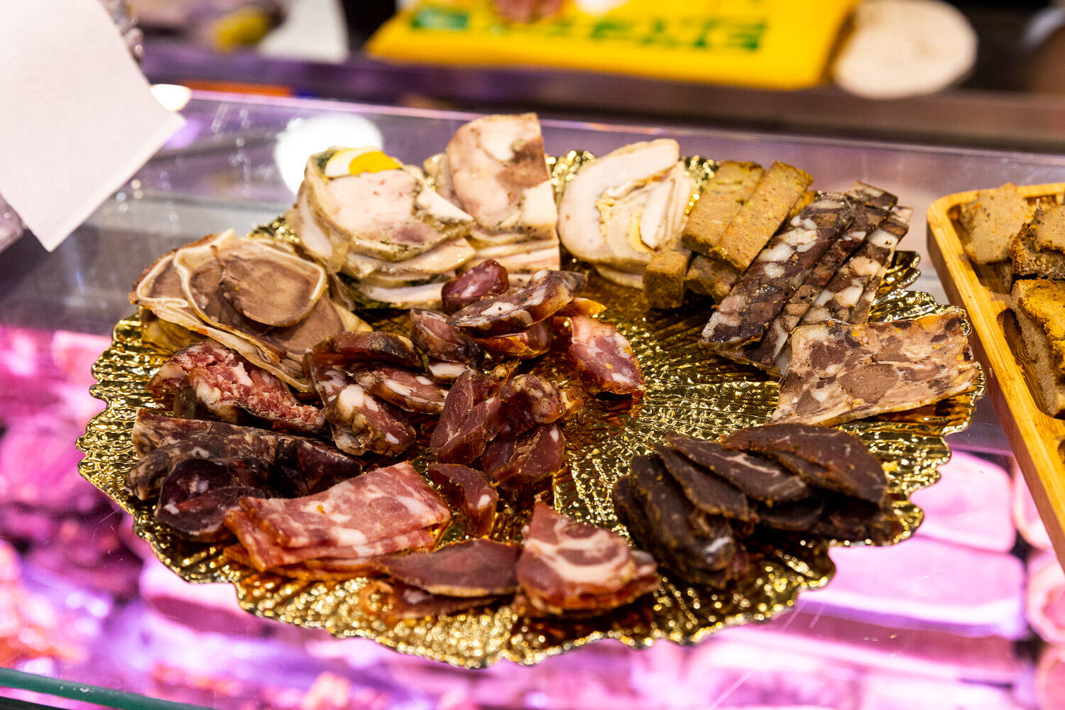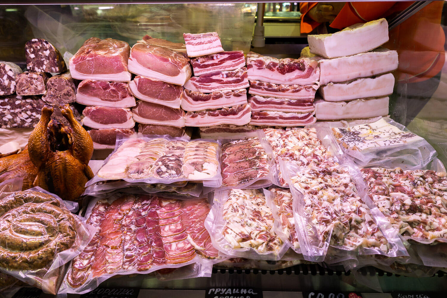 На следующей точке продавец показывает домашние паштеты, копченую курицу, колбасы, сало.