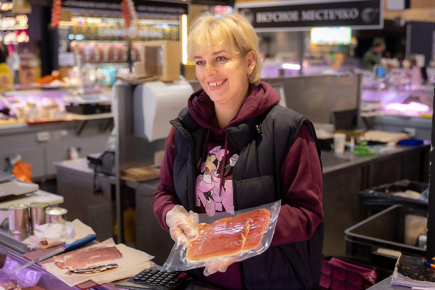 Спрашиваем, какой самый высокий чек из недавних. Нас отправляют к Марине, которая продает хамон: высокие чеки – это к ней.