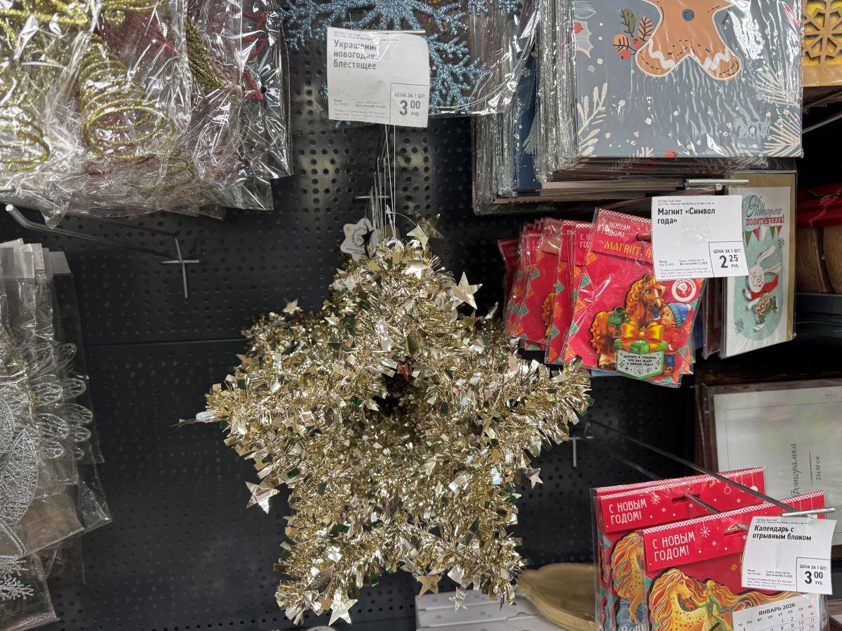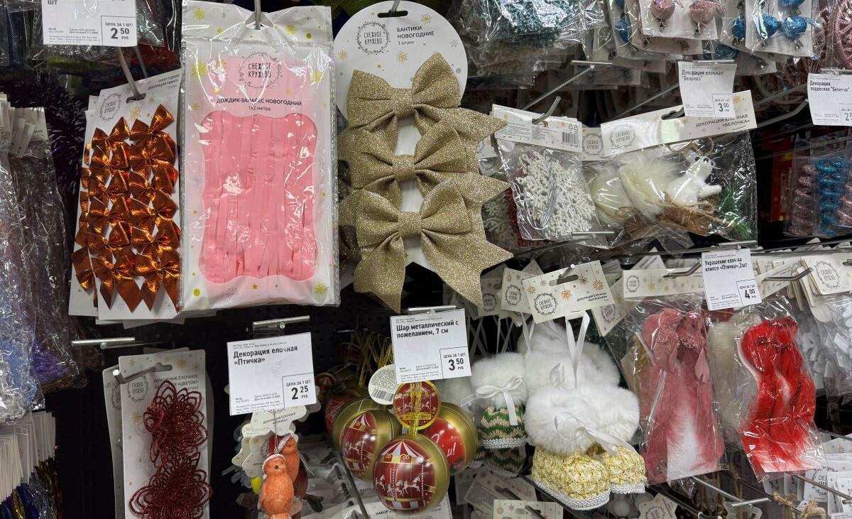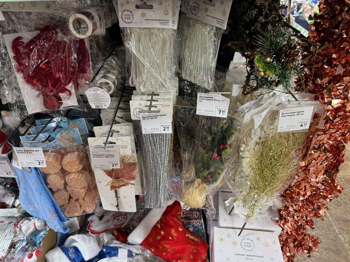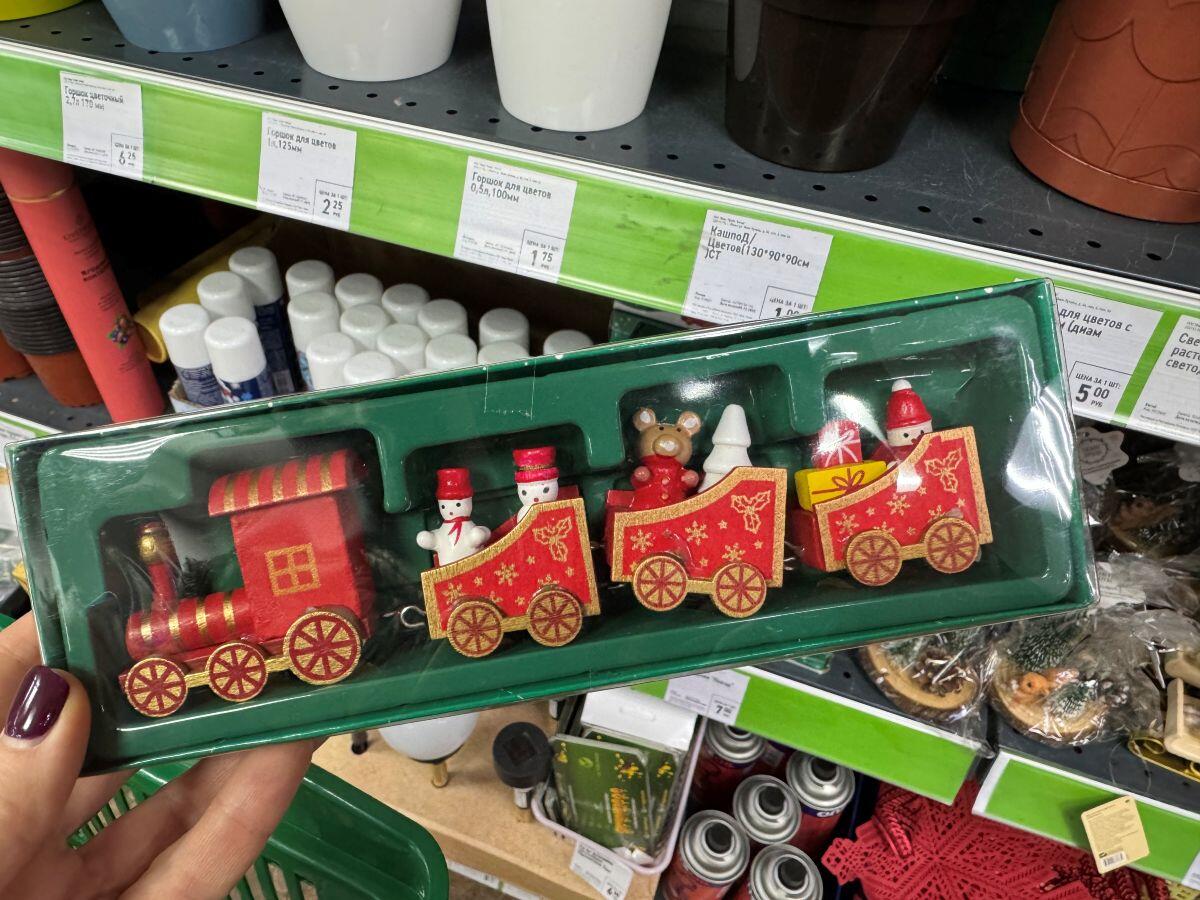 Набор мелких шаров из пластика отдают всего за 4 рубля, а в упаковке целых 12 штук. Блестящая увешанная дождиком звезда за 3 рубля подойдет на окно или просто в интерьер. Декоративные игрушки под елочку, на камин, а может, просто в подарок – от 6,50 до 9,25. Деревянный поезд с вагончиками перекочевал на прилавок из прошлого года, поэтому цена на паровоз не кусается – всего 7 рублей.