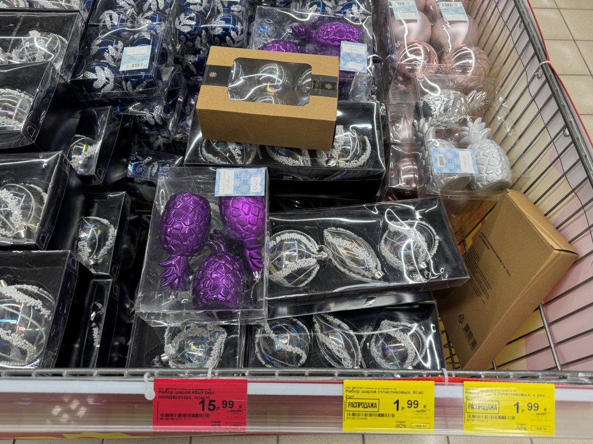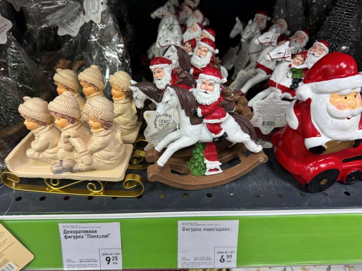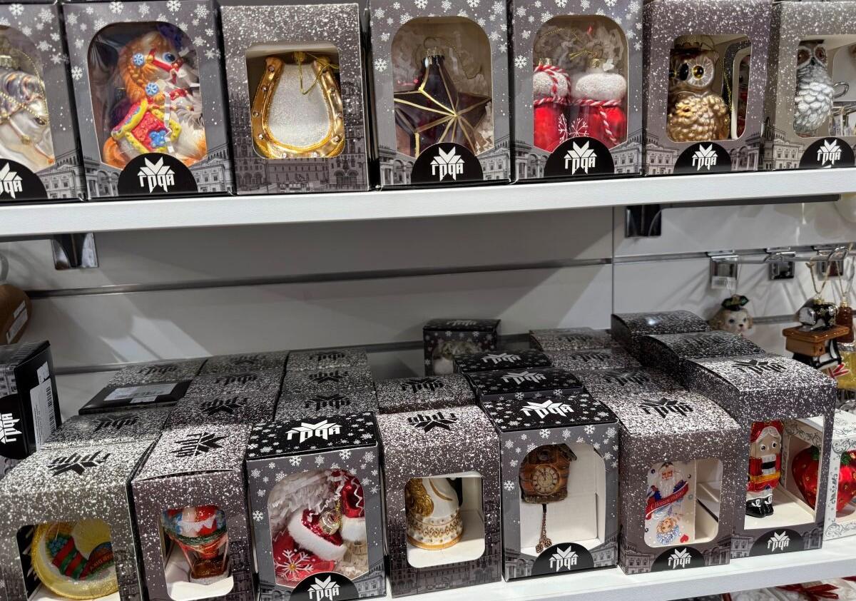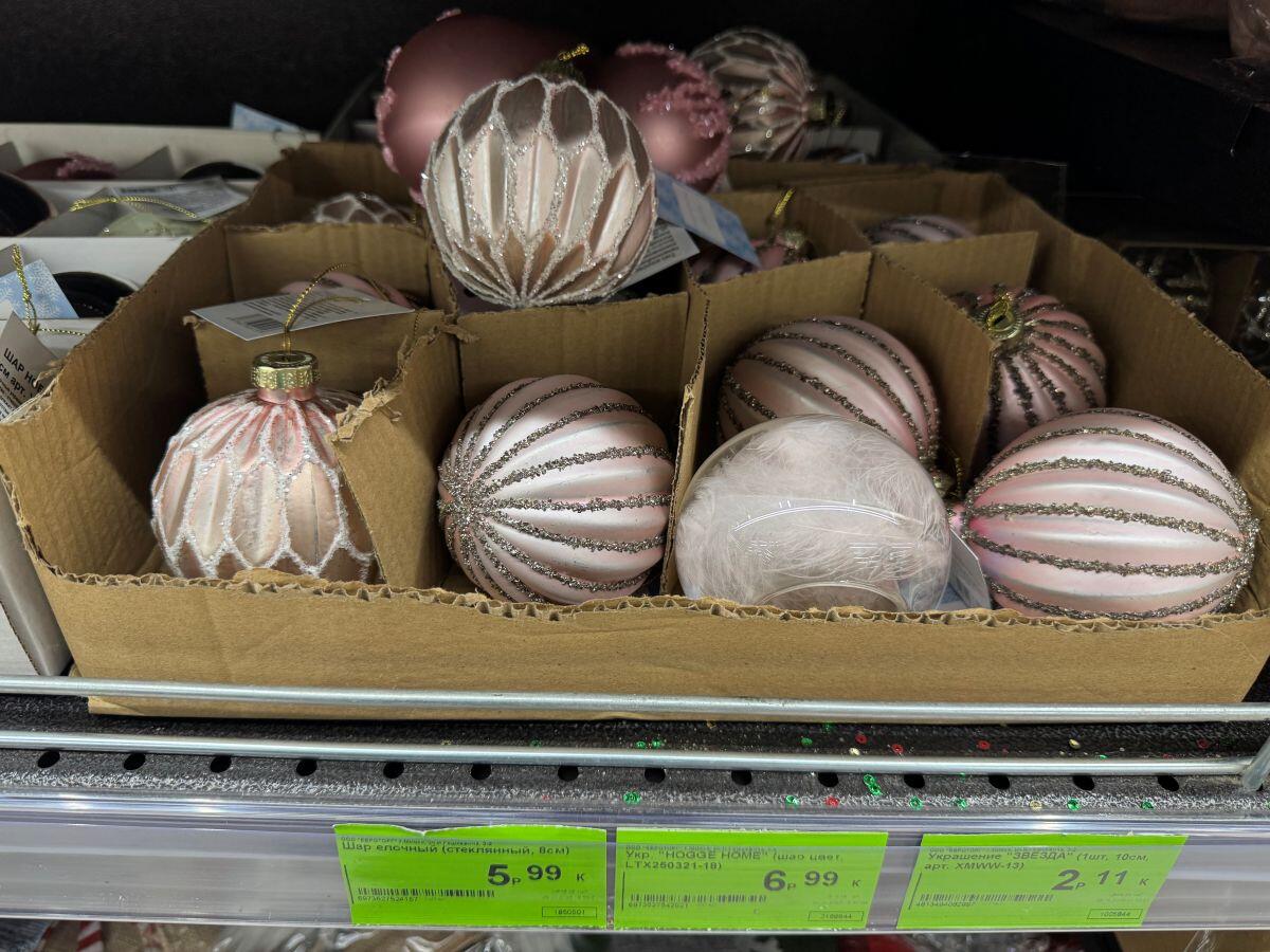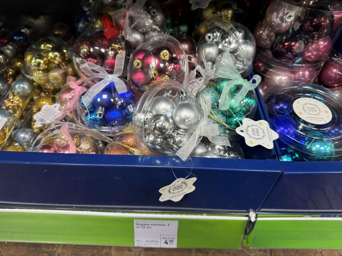 Белорусский бренд «Грай» удивляет елочными украшениями каждый год. Представлены шары, звери, сласти и даже сказочные персонажи. Например, в «Гиппо» есть отдельный стенд от производителя. Каждая фигурка упакована в свою коробочку, что уже можно считать самостоятельным подарком, а еще позволяет в сохранности доставить хрупкое стекло. Самые интересные фигурки стоят в среднем 25 рублей за штуку, лишь на нижних стеллажах удалось обнаружить пару шаров за 10,41 и 11,71.
