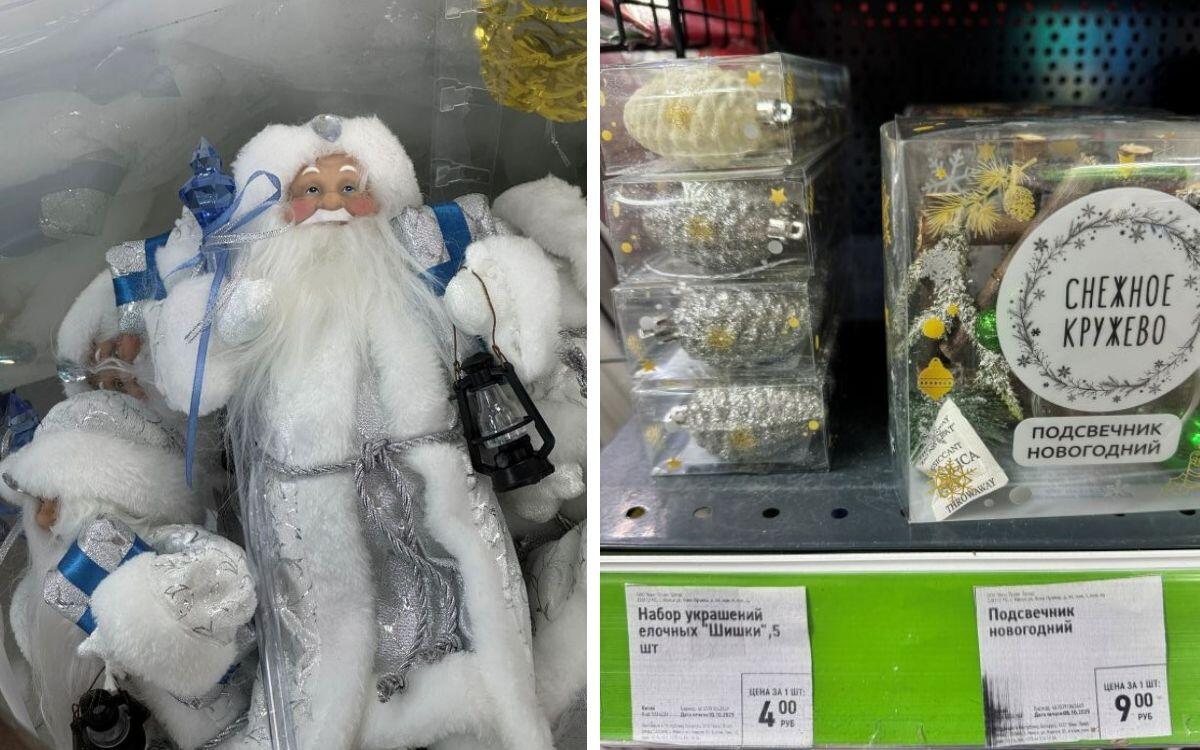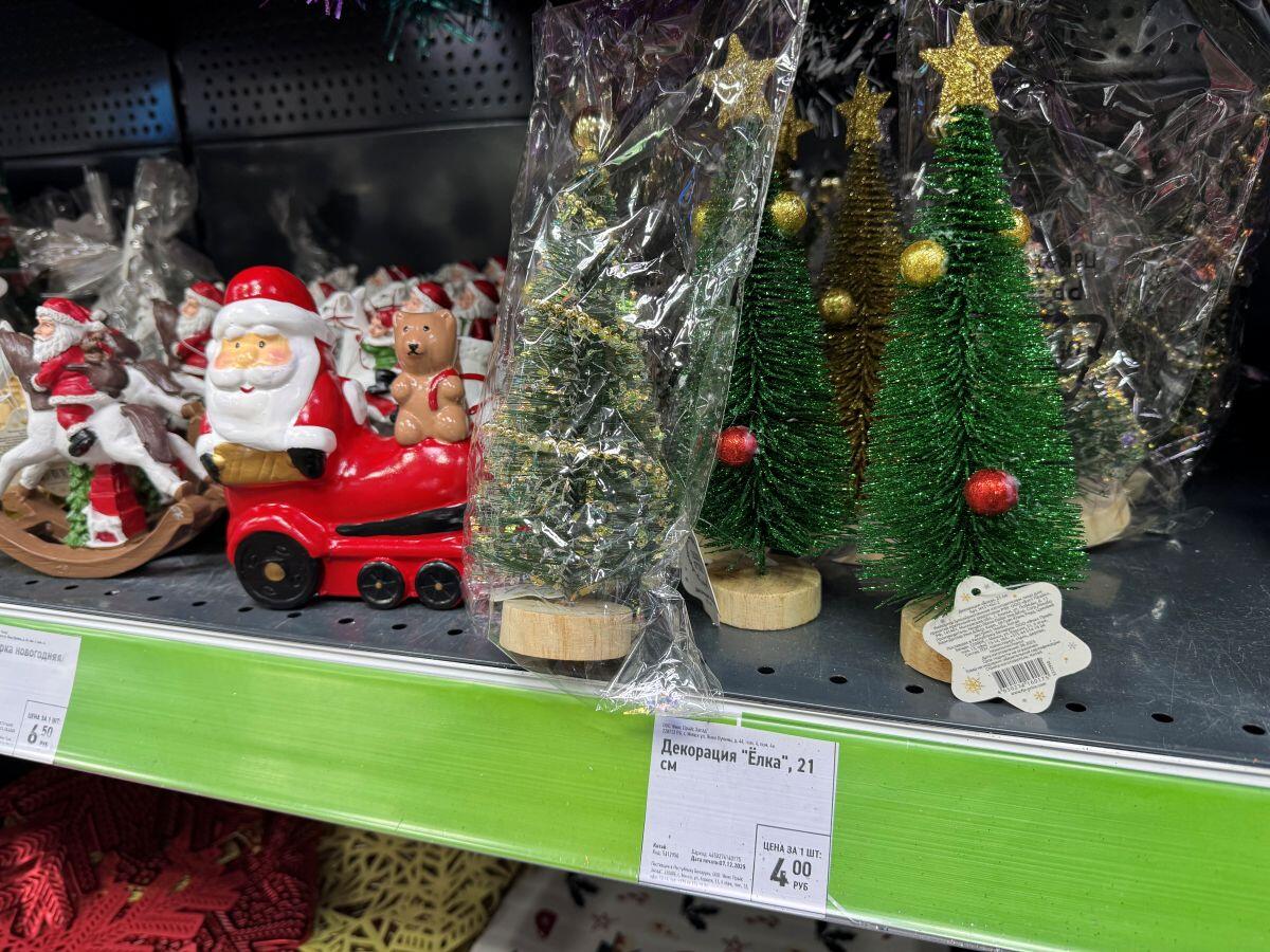 За 4 рубля найдена милая елочка высотой 21 см, которая подойдет на рабочий стол. Солидный Дед Мороз под елку в белом убранстве и с посохом стоит 18 рублей. Сама фигурка легкая, но устойчивая, а вот Снегурочки в пару к Деду не нашлось. Рядом с зимним волшебником продается искусственная ель повыше: 70 см за 7 рублей.