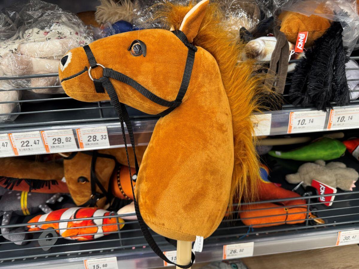 Помимо подвесных вариантов в стекле и пластике найден реквизит для хоббихорсинга – езды на палке с головой лошади. Коричневый конь по кличке «Ветерок» подойдет для детей от трех лет. Скакун создан и отшит на отечественной фабрике, поэтому не стоит больших денег – 35,88. На стеллаже в гипермаркете «Гиппо» лошадь на палке постоянно в центре внимания у покупателей, при этом наибольший интерес она вызывает у взрослых.