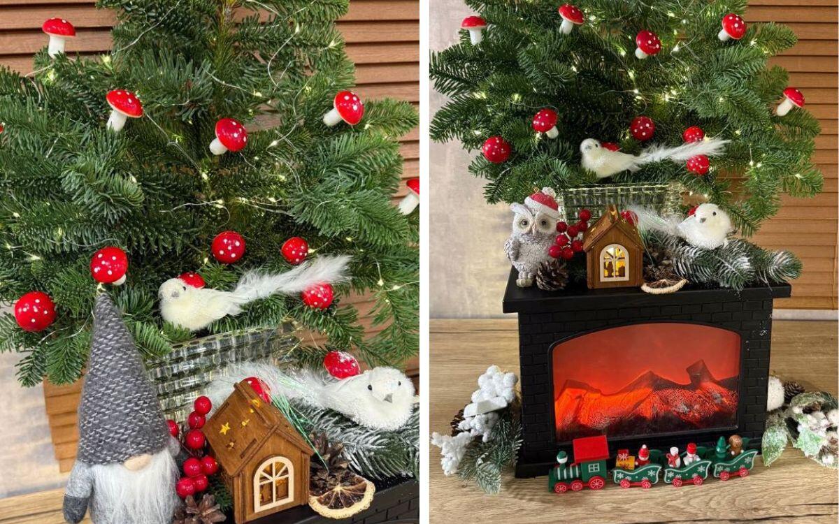 В качестве каркаса выступила ветка нобилиса из цветочного магазина. Она долгое время не теряет форму и приятно пахнет. Там же были найдены мелкие игрушки-грибы. Железная дорога, камин, веточки и гномы – из Fix Price, а сова прилетела из Mile. Шишки найдены в лесу, апельсины героиня сушила самостоятельно. На весь декор ушло 80 рублей.