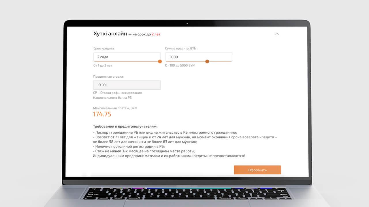 Первый. На сайте Банка БелВЭБ на странице онлайн-кредита выбрала сумму и срок, нажала на «Оформить»: