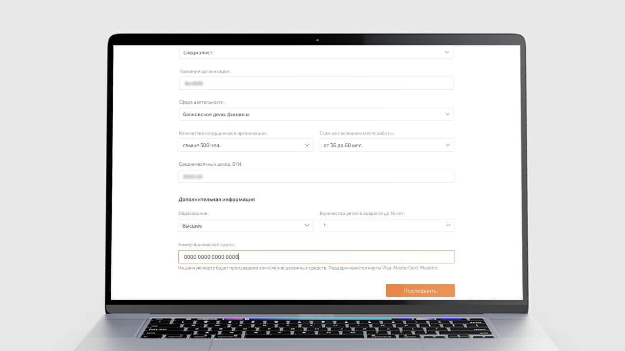 Четвертый. Заполнила короткую кредитную анкету и ввела номер карты для зачисления денежных средств. Стоит отметить, что это может быть карта любого банка Беларуси.