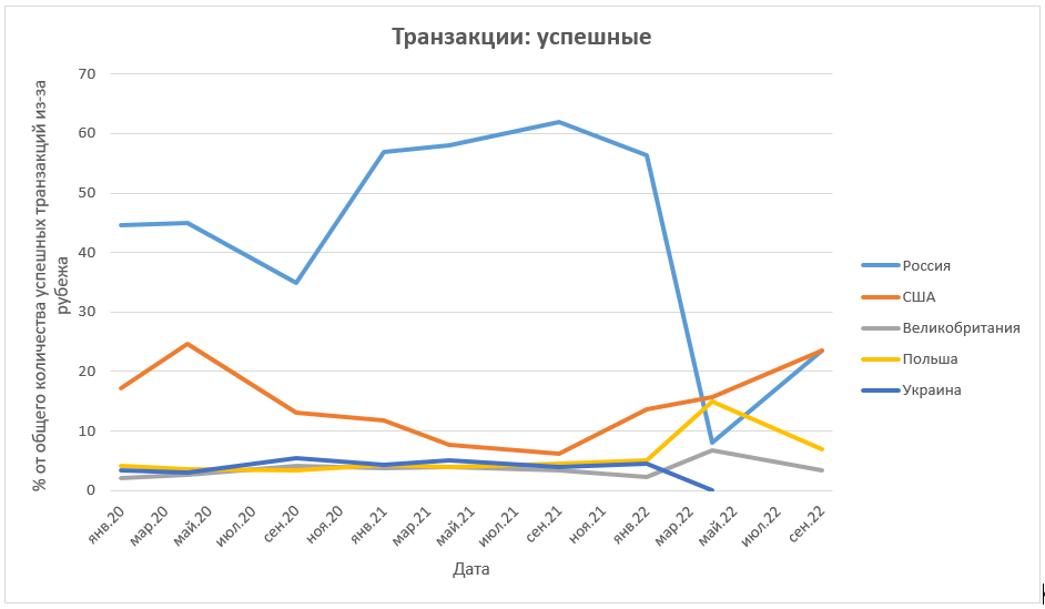 Интернет–платежи по картам, эмитированными российскими банками, долгое время занимали первое место в общем объеме «иностранных» платежей. Весь 2021 год более половины успешных транзакций из–за рубежа были российскими. Пик был достигнут в сентябре 2021–го – 61,95%.