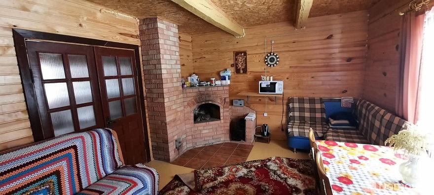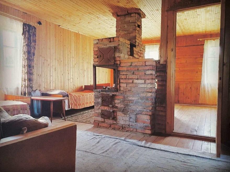 Внутри дома 40 квадратных метров площади, хороший косметический ремонт с вагонкой на стенах, русская печь с камином и пробуренная скважина на территории. Автор пишет, что ближайшие соседи живут в 100 метрах, а недалеко от дома протекает Нарочь.