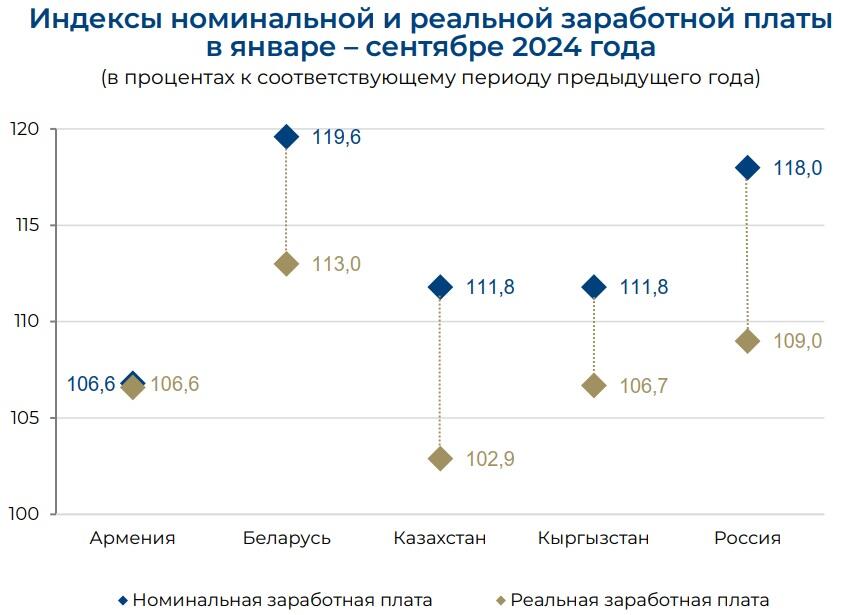 По информации Евразийской экономической комиссии (ЕЭК), в январе – сентябре 2024 года по сравнению с аналогичным периодом 2023 года среднемесячная номинальная зарплата увеличилась во всех государствах ЕАЭС.