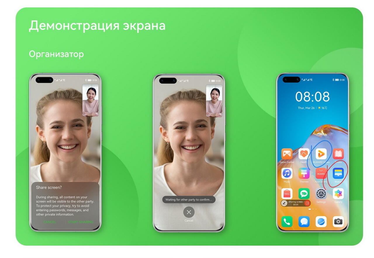Во время видеовызова при необходимости можно включать демонстрацию экрана. Функция позволяет показывать и совместно просматривать документы, видео, изображения. Для наглядности можно отмечать важные места на экране, например, пункты инструкции, если пытаетесь помочь кому-то разобраться с устройством нового гаджета.