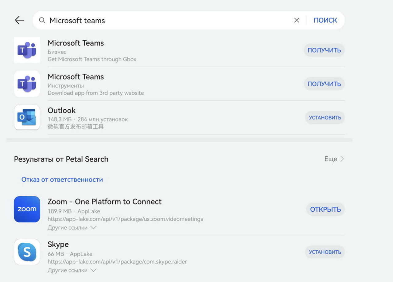 Это дает пространство для выбора пользователям планшета. Так, Google Meet, Discordи Zoom мы скачали из AppLake (ЭппЛэйк) и подключились к ним с помощью microG (микроДжи), а Microsoft Teams установили из Google Play через Gbox (ДжиБокс). А найти все эти приложения мы смогли, воспользовавшись внутренним поисковиком Huawei AppGallery, который показал все возможное варианты для установки.