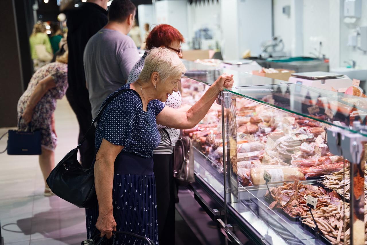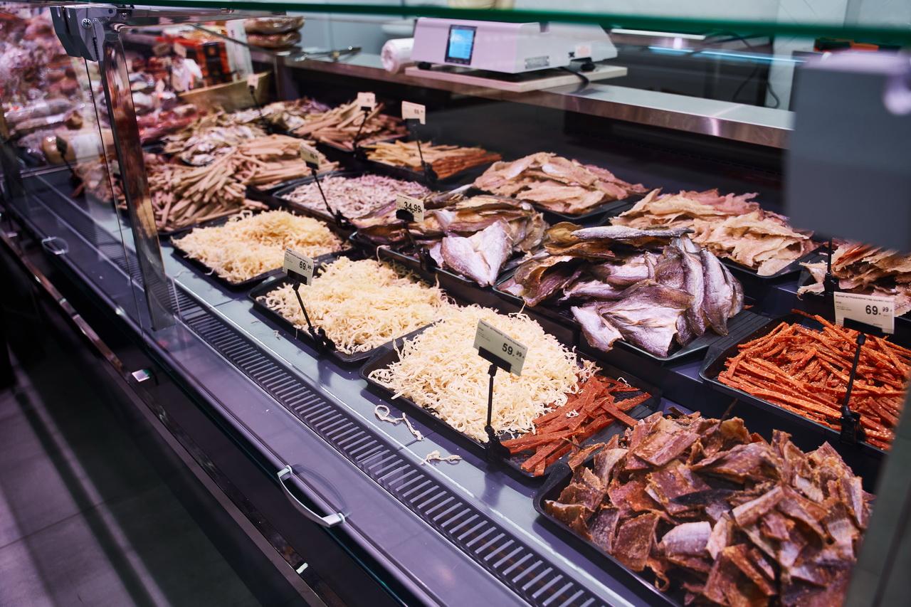 Большая мясная витрина предлагает широкий выбор деликатесов, в том числе выдержанные стейки и утиные ножки. Продуман прилавок со свежими овощами и фруктами.