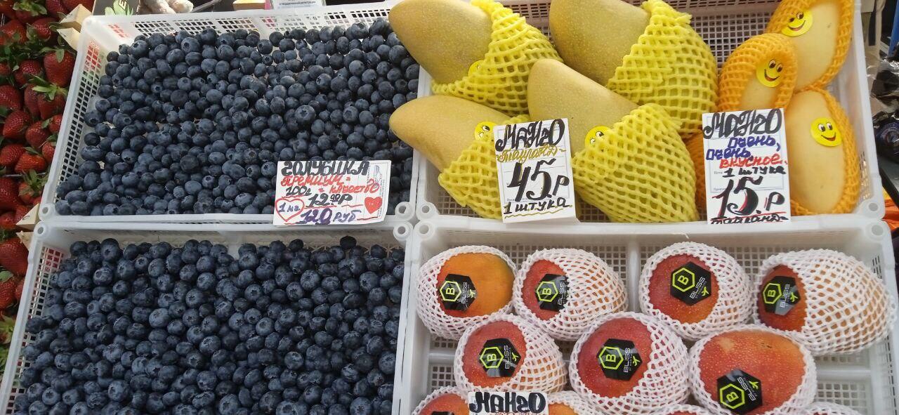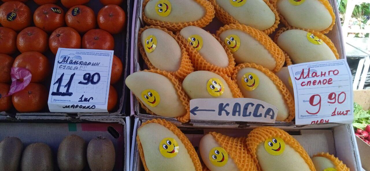 Рядом огромные манго (раза в 4 превосходящие по размерам фрукт из сетевого магазина) – по 45 рублей за штуку.