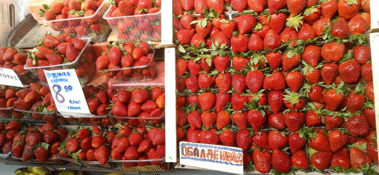 Еще один товар, не вчера ставший сезонным в эту пору – клубника. Судя по ценникам, прибыла она в Беларусь из нескольких стран. Ягода отличается внешним видом и размером, но цена у большинства торговцев примерно одинакова, 18-20 рублей.