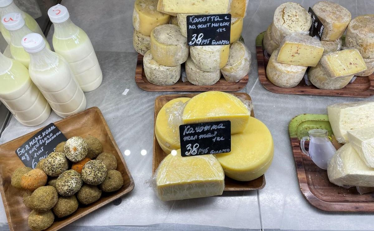 Настоящее изобилие продуктов от белорусских буренок и козочек представлено в зоне молочной продукции. Сырная конфетка из коровьего молока – 4,50 руб. Изделие похоже на полезное «Рафаэлло». Качотта с пажитником – 38 рублей за 1 кг. Пармезан из молока козы – 65 рублей за 1 кг. Продают итальянский сыр горгонзола – 11 рублей за 100 г. Предлагают также адыгейский, сулугуни домашний и уже запеченный, а также сыр в виде рулета с форелью. Детский мягкий высушенный сыр в шариках «Курут» – 5 руб. за упаковку.