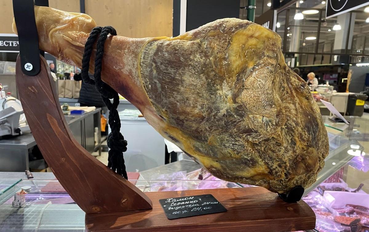 Мясной ряд предлагает покупателем оленину, баранину и телятину. Можно приобрести мясо лани, уток, кроликов. Лопатка оленя на кости – 29 рублей за 1 кг, лани в продаже не было, но можно сделать заказ. Лопатка баранины – 31,90 руб.; буженина из телятины – 55 рублей за 1 кг. За 100 г хамона с выдержкой 24 месяца просят 24 рубля.