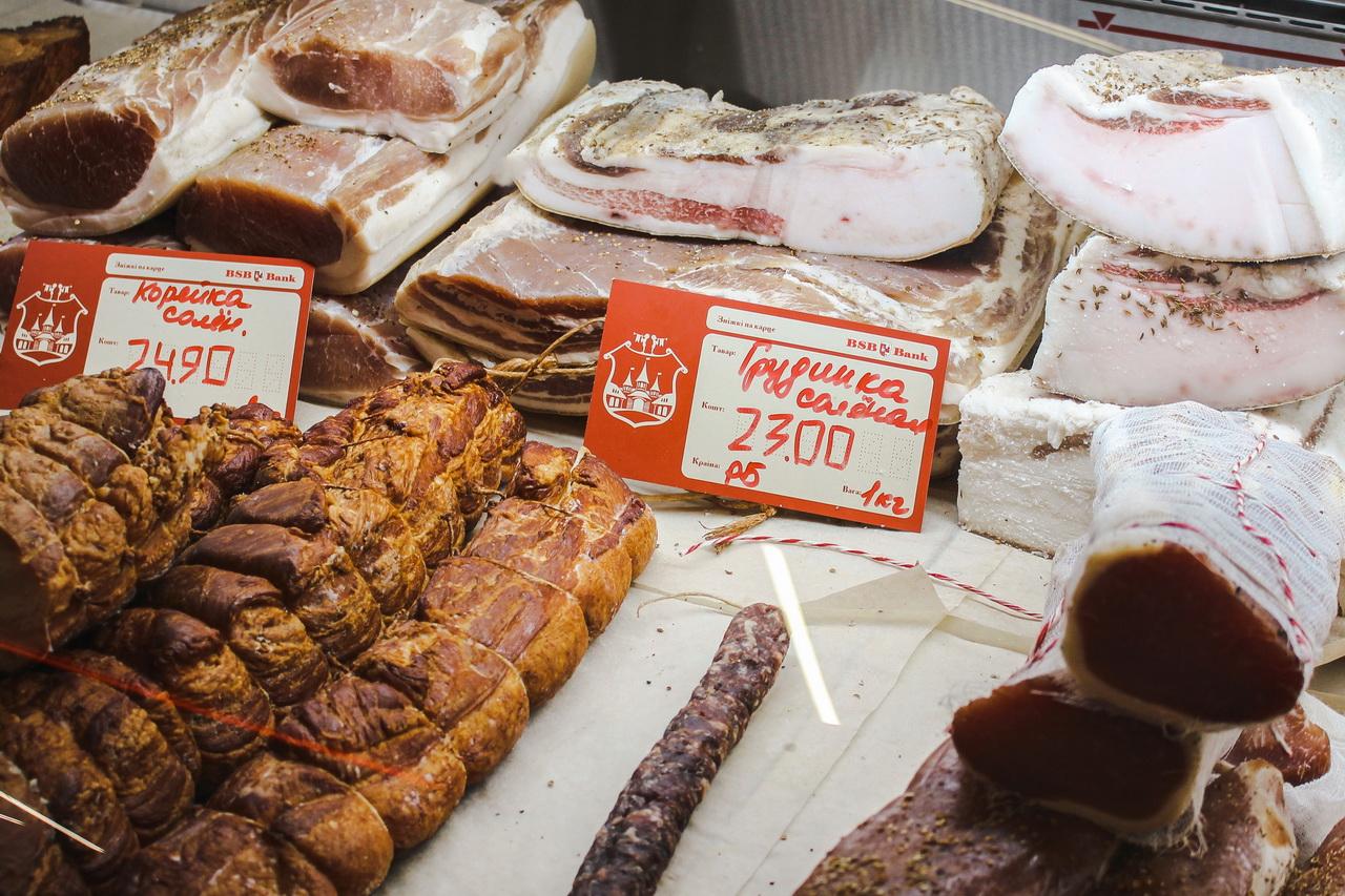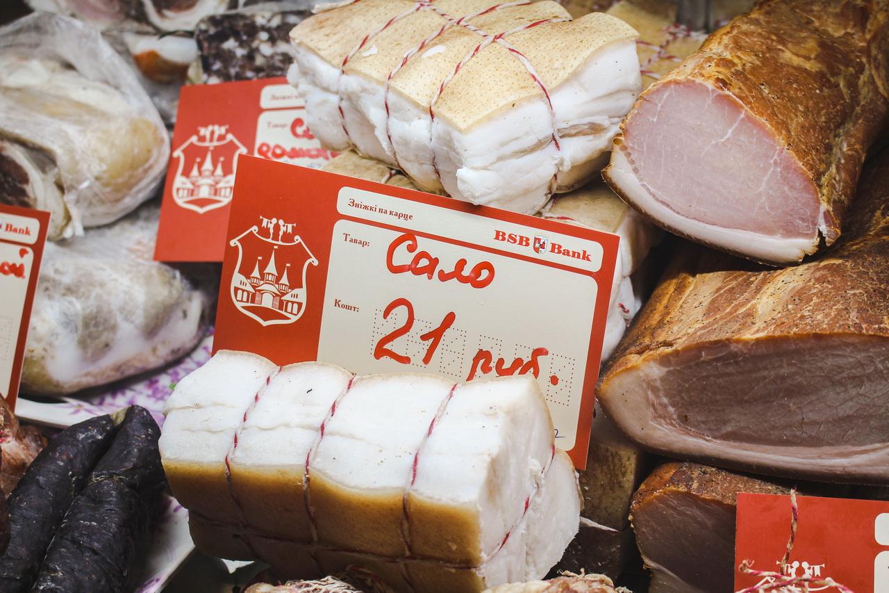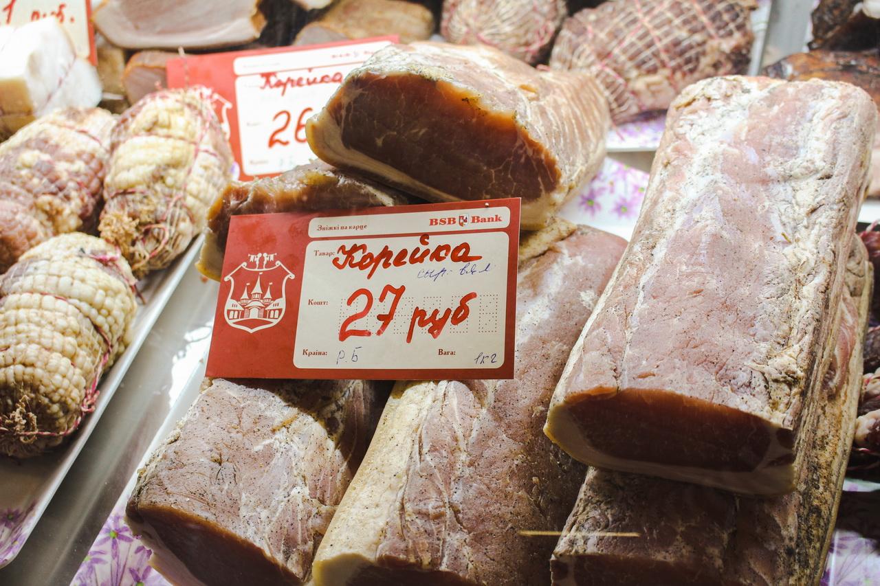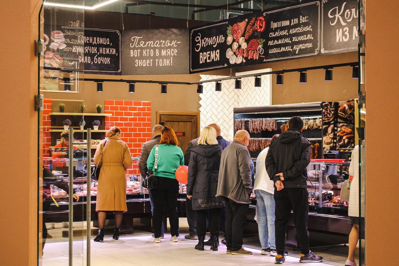 Павильон «Пятачок». Вывеска гласит, что именно тут начинается территория мяса. Помимо свежей свинины и говядины, представлен широкий ассортимент замороженной продукции. Килограмм блинчиком с мясом – 11,90; классические голубцы – 10,50; домашние чебуреки – 9,70; хинкали – 10,70. За полендвицей, кумпячком, а также салом и бочком выстроилась небольшая очередь. При оплате картой «Сеница» обещают небольшие бонусы.