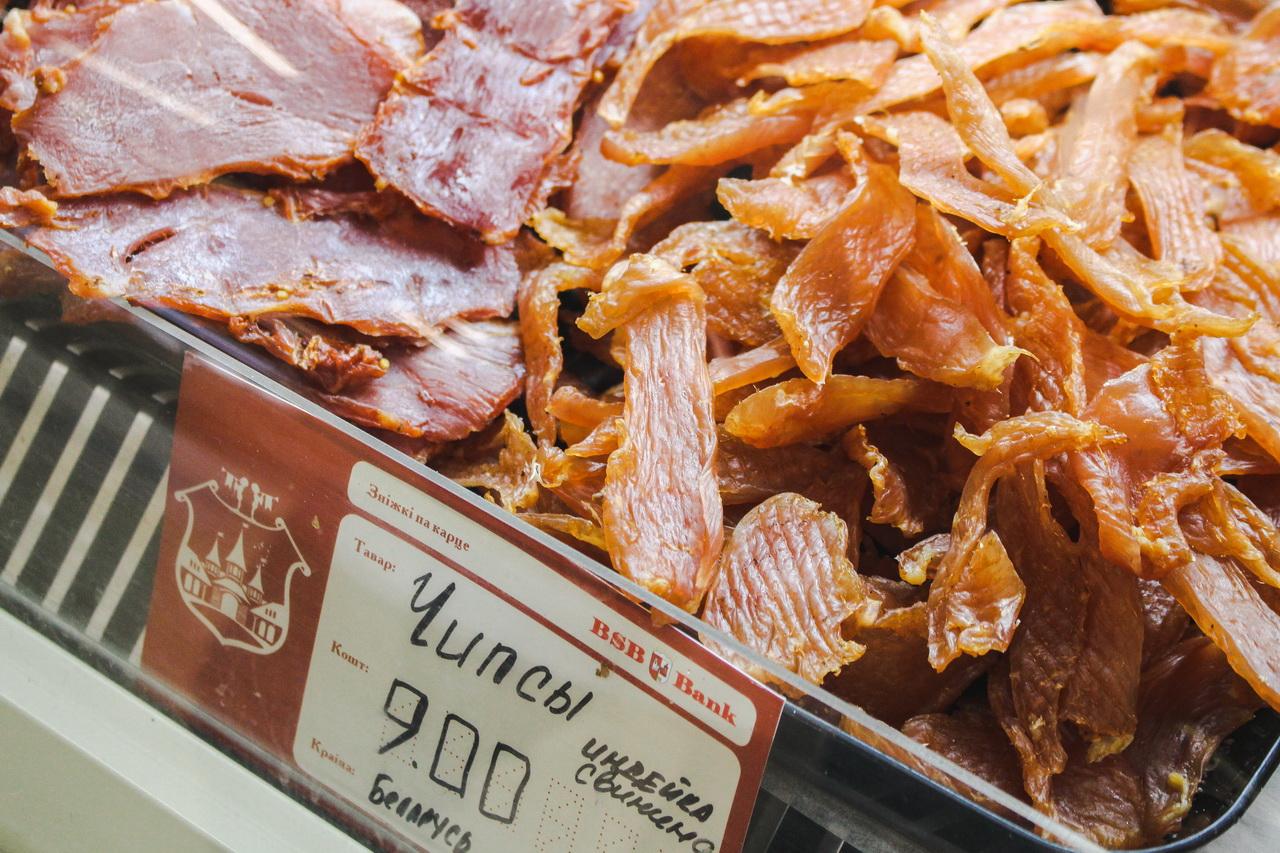 Много мясной фермерской продукции. Отыскать можно даже чипсы из индейки за 9 рублей. Деревенская свинина – 37,10; «Рулька в желе» 23,10; корейка 27 рублей, мясной деликатес пасторма – 28 рублей. Сало 21 рубль, корейка соленая 24,90; грудинка соленая 23 рубля.