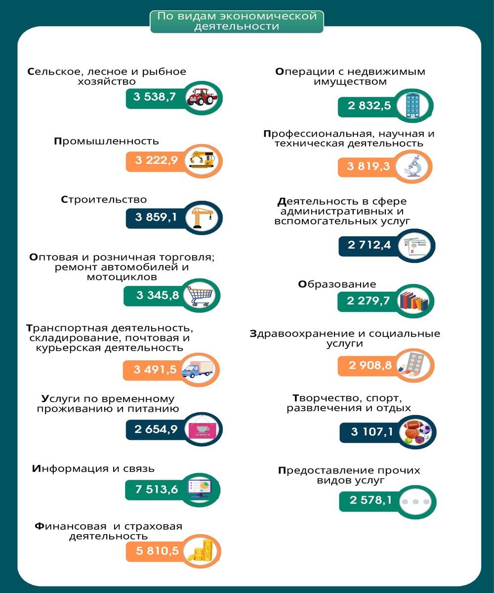 В разрезе видов экономической деятельности первое место занимает сфера «Информация и связь» — 7513,6 руб.