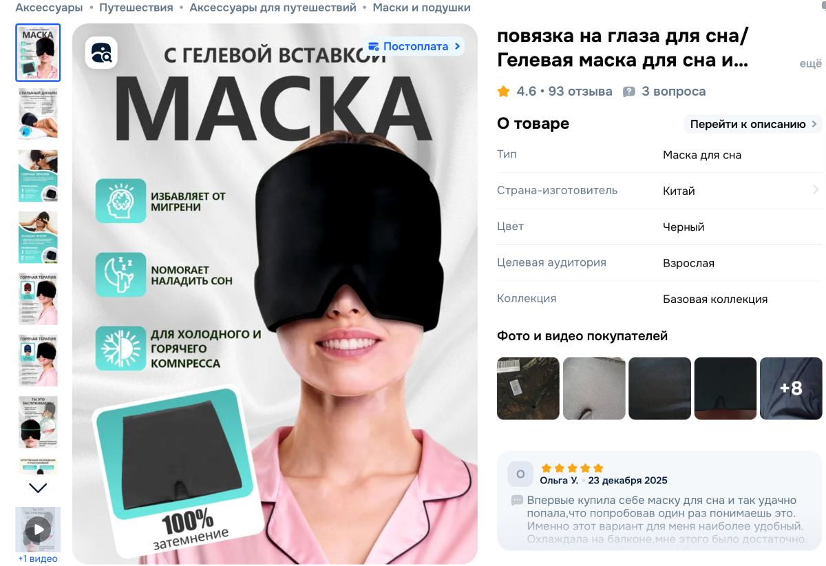 Маска-шапка с эффектом холодной и горячей терапии позволяет быстрее уснуть. По заверениям продавца, аксессуар поможет справиться с бессонницей и мигренью, снимет отеки и напряжение в шее. Маску можно использовать ежедневно как дома, так и в путешествиях. На аксессуар 93 отзыва, а товар относится к популярным. Покупатели отмечают, что маска помогает снять усталость глаз и облегчить головную боль. Девайс стоит от 14 до 130 рублей.