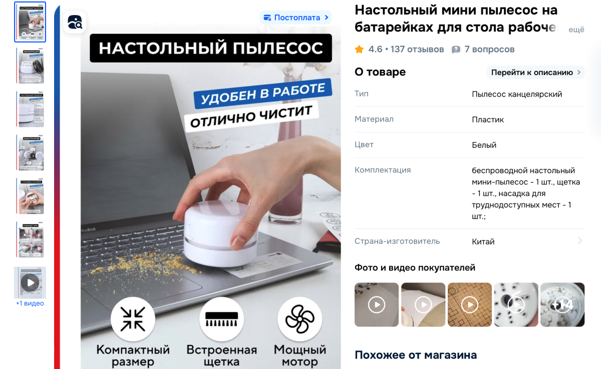 Компактный помощник предназначен для быстрой уборки на рабочем или детском столе. В описании товара сказано, что пылесос на батарейках достаточно мощный, чтобы справиться с пылью и крошками. Также хорошо поможет с очисткой клавиатуры. В отзывах девушка рассказала, что использует гаджет в салоне красоты, чтобы избавиться от маникюрной пыли. Мини-пылесос стоит от 10,67 до 40 рублей.
