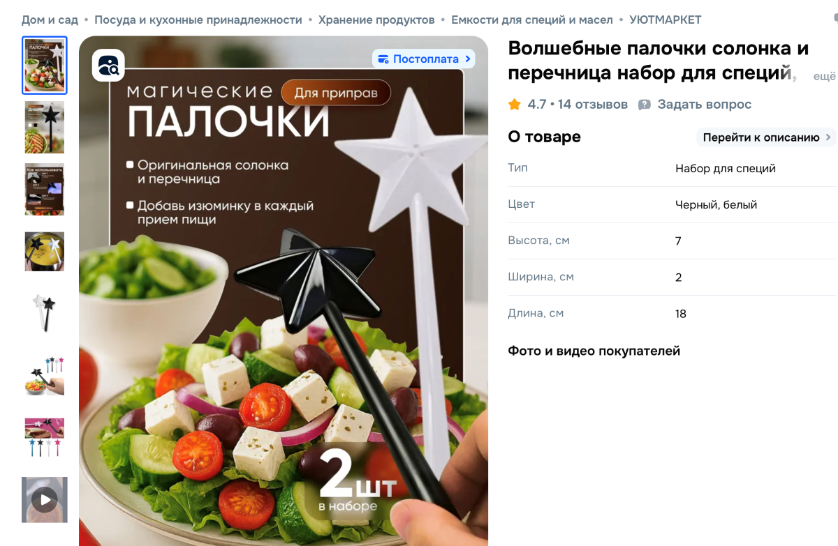 Набор для специй в виде магических палочек обещает атмосферу волшебства прямо на кухне. В карточке товара сказано, что подарок подходит для соли, перца и других приправ. В числе преимуществ – компактность набора, который можно взять на пикник или на дачу. Палочки продаются сразу в подарочной упаковке. Набор сейчас на скидке и стоит всего 5,22 рубля.