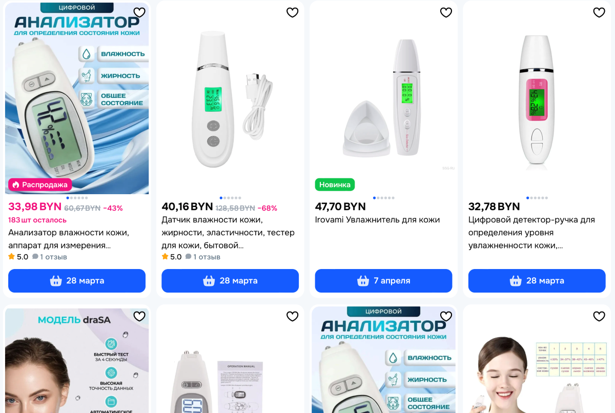 Аппарат способен проанализировать состояние кожи на вашем лице. Гаджет показывает степень увлажненности тканей. Устройство сохраняет последние замеры, чтобы после использования увлажняющих масок можно было посмотреть, улучшились ли показатели. Пользователи портативного прибора в отзывах отмечают, что гаджет им нравится и прост в использовании. Стоимость анализатора – от 31 до 167 рублей.