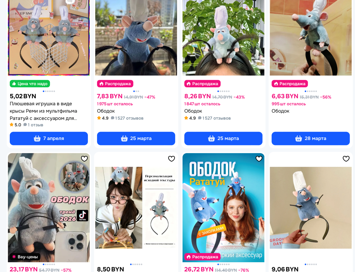 Украшение подойдет для фанаток одноименного мультфильма. В маленьких лапах плюшевой игрушки есть зажимы, позволяющие зафиксировать волосы – прямо как в мультфильме. В отзывах указано, что обручу особенно рады дети. Минимальная стоимость аксессуара – 5,02.