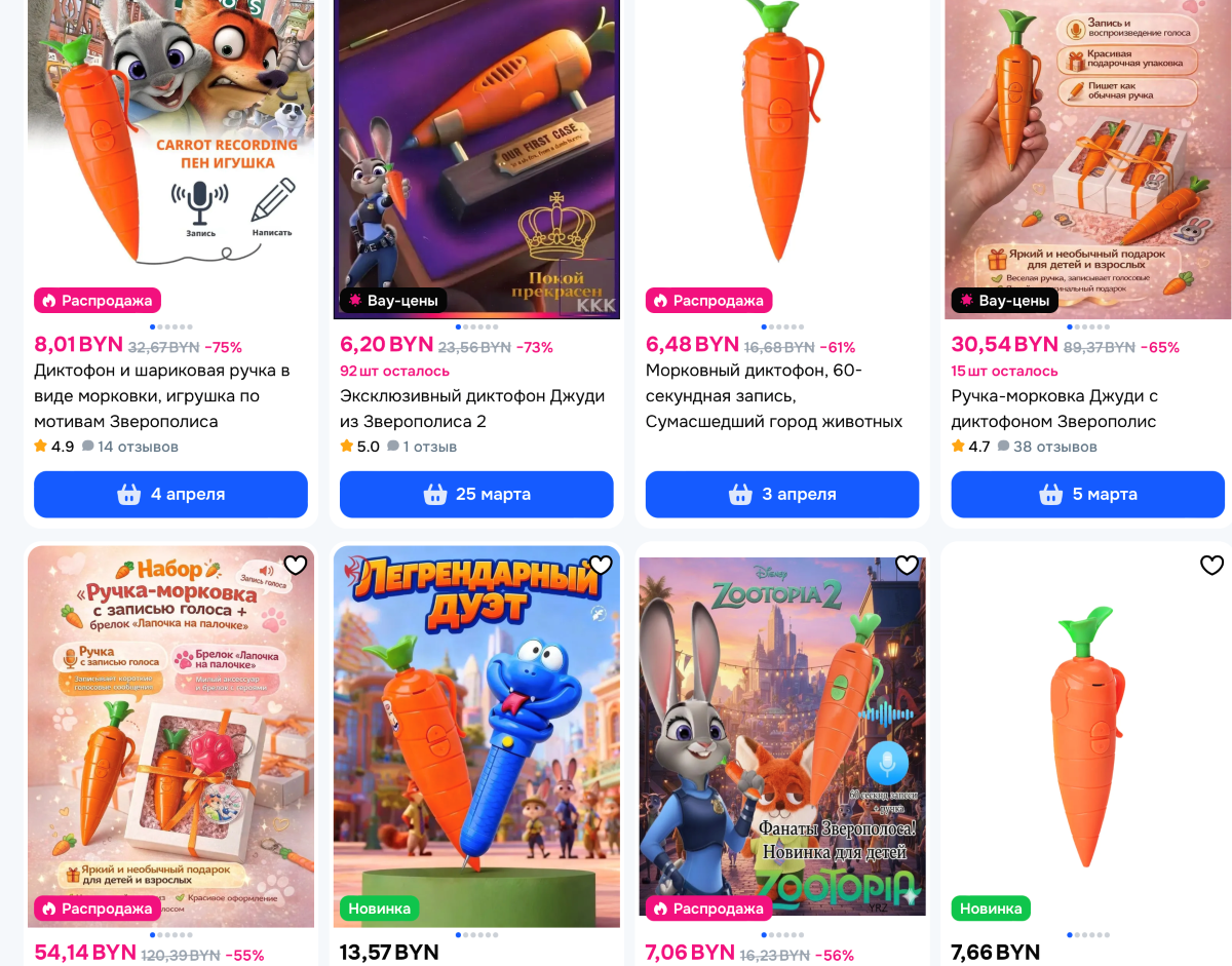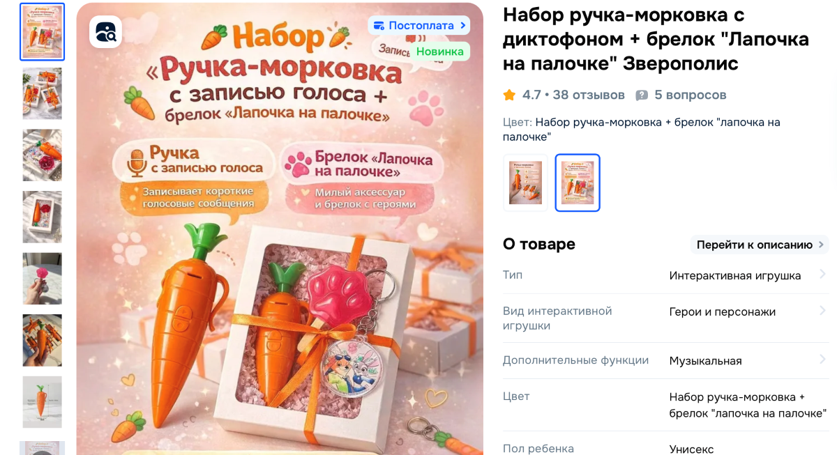 Пластиковая ручка в виде морковки прямиком из мультфильма «Зверополис» объединила в себе опцию письма и записи звука. Игрушка стоит 8,01, также доступны варианты в подарочной упаковке с брелком «Лапочки на палочке» за 54,14.