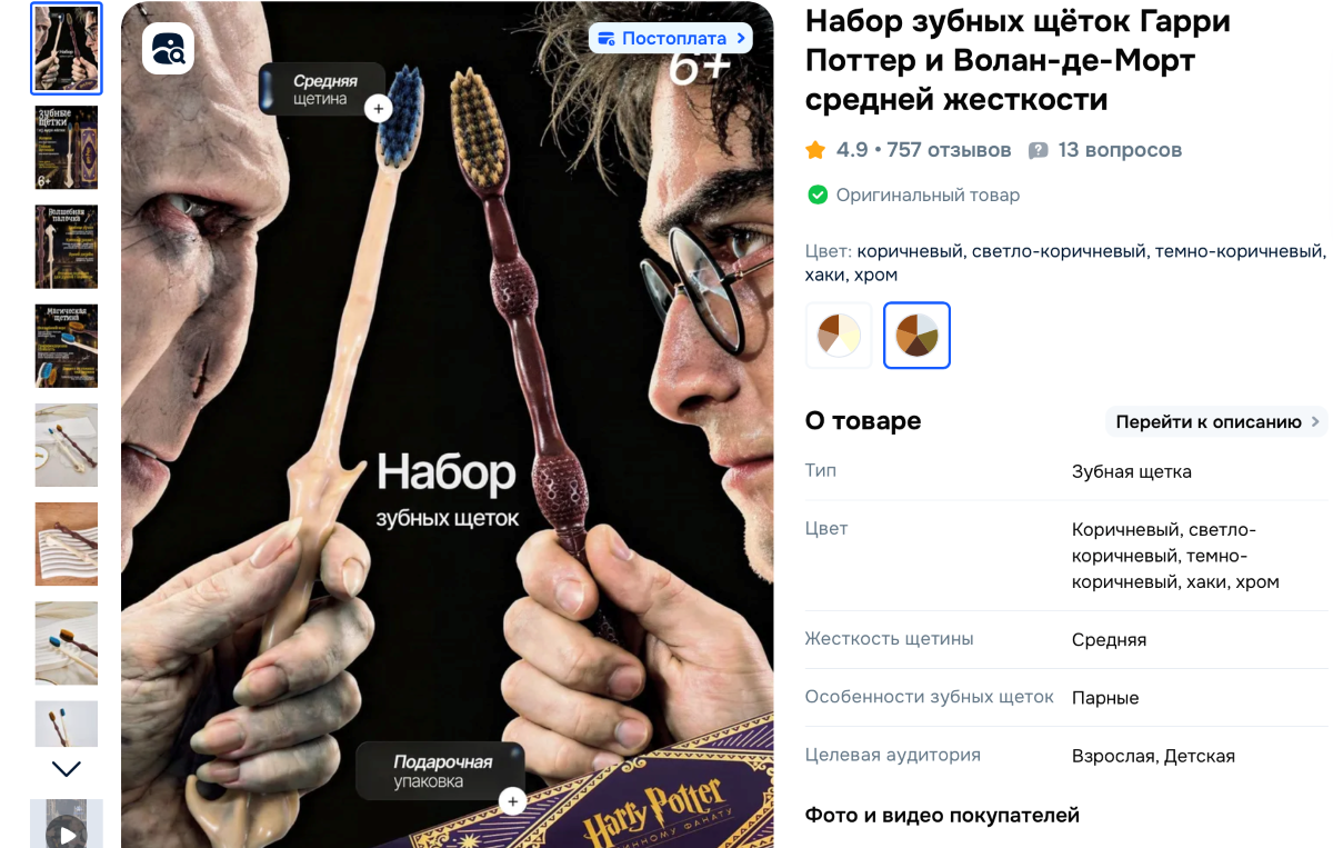 Зубные щетки предназначены для фанатов волшебного мира Джоан Роулинг. В наборе сразу две щетки, посвященные Гарри Поттеру и Волан-де-Морту, которые понравятся маленьким и взрослым поклонницам. Продавец обещает, что необычные предметы добавят в ежедневный ритуал щепотку магии. В отзывах сказано, что они средней жесткости, а щетина качественная. Стоимость – 52 рубля.