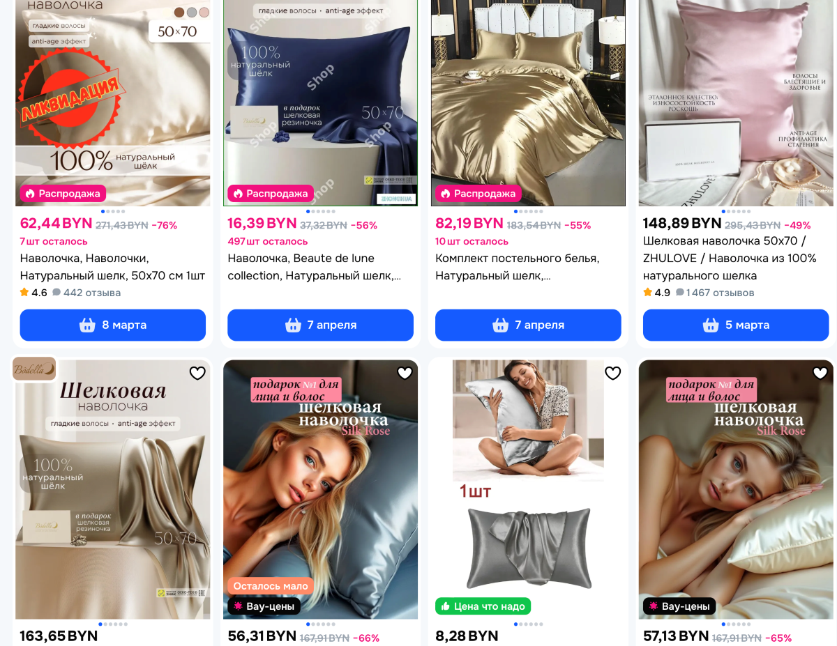 Косметологи считают, что сон на шелковой наволочке бережет волосы от спутывания, а лицо – от отеков и заломов. Также натуральная ткань позволяет дольше сохранить наращенные ресницы. В отзывах покупательницы пишут, что сон на такой наволочке – настоящая роскошь. На товар более восьми тысяч отзывов, где помимо свойств шелка хвалят аккуратную упаковку. Наволочка обойдется в среднем в 62 рубля, но при покупке нужно внимательно читать состав, поскольку есть варианты с добавлением вискозы.