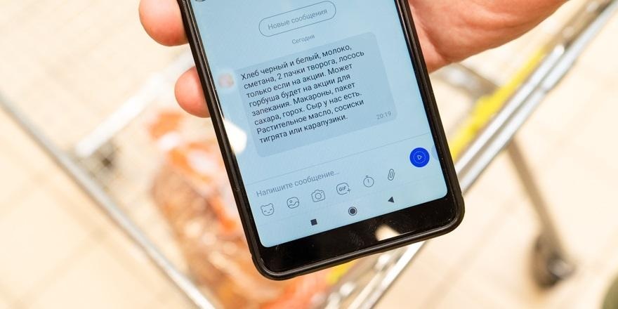 Василий проверяет список в телефоне, написанный женой. В нем – хлеб, молочка, сосиски, макароны, рыба, сахар, горох, растительное масло.
