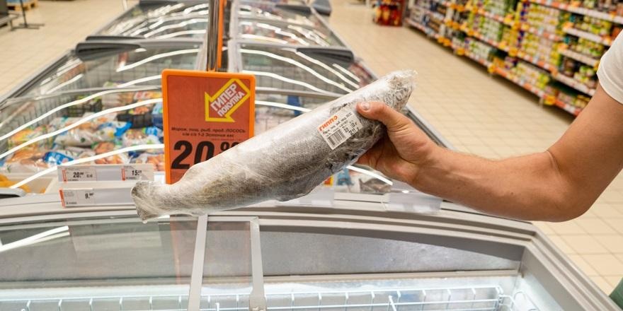 Снова сверяемся со списком. Следующий пункт – лосось или горбуша по акции. Василий уверенным взглядом знатока осматривает ассортимент замороженной рыбы и морепродуктов. Сразу перед нами в холодильнике королевские креветки по акции – 16,99 руб. за кг.