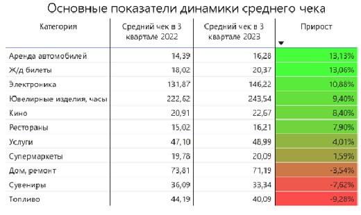 Традиционно самые высокие показатели по среднему чеку относятся к покупке ювелирных изделий и часов (244 рубля, прирост более 9% к третьему кварталу 2022 года) и электроники (146 рублей, прирост почти 11%). Снизились расходы белорусов на топливо, сувениры, дом, ремонт.