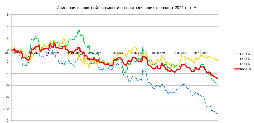 В результате валютная корзина снизилась к белорусскому рублю на 0,5%. Это третья неделя подряд укрепления белорусского рубля к корзине. Можно отметить, что к концу недели в очередной раз и доллар, и евро, и валютная корзина обновили минимумы с начала года .