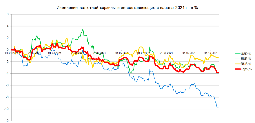 После двух недель роста валютная корзина снизилась сразу на 0,99%. Кстати говоря, это максимальное снижение корзины за неделю с середины июля. При этом к концу недели и доллар, и евро, и валютная корзина обновили минимумы с начала года .
