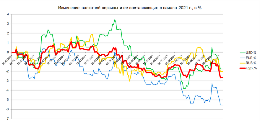 В результате валютная корзина подешевела за неделю на 1,5%. Это максимальное недельное падение корзины с апреля 2020 года. Кстати говоря, при этом евро и валютная корзина обновили минимумы с начала года.