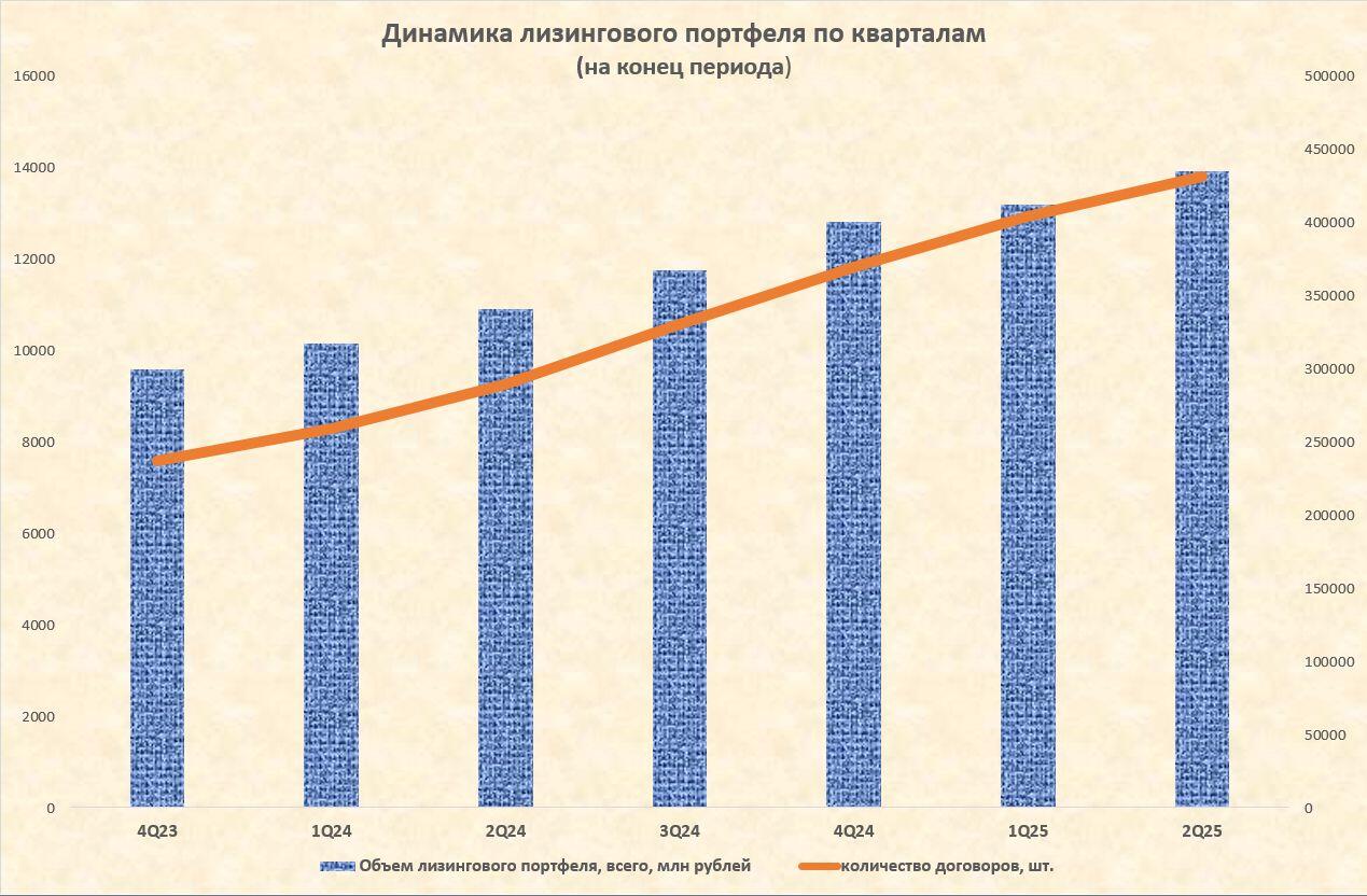 Рост лизингового портфеля в сегменте потребительского лизинга был значительно выше, чем в сегменте инвестиционного лизинга. Удельный вес договоров потребительского лизинга в совокупном объеме лизингового портфеля по сравнению с показателями на 01.01.2025 г. увеличился с 21,71% до 23,6%, в сумме заключенных договоров с 32,6 % до 33,8%, в объеме нового бизнеса уменьшился с 32,7 % до 31,1 %.