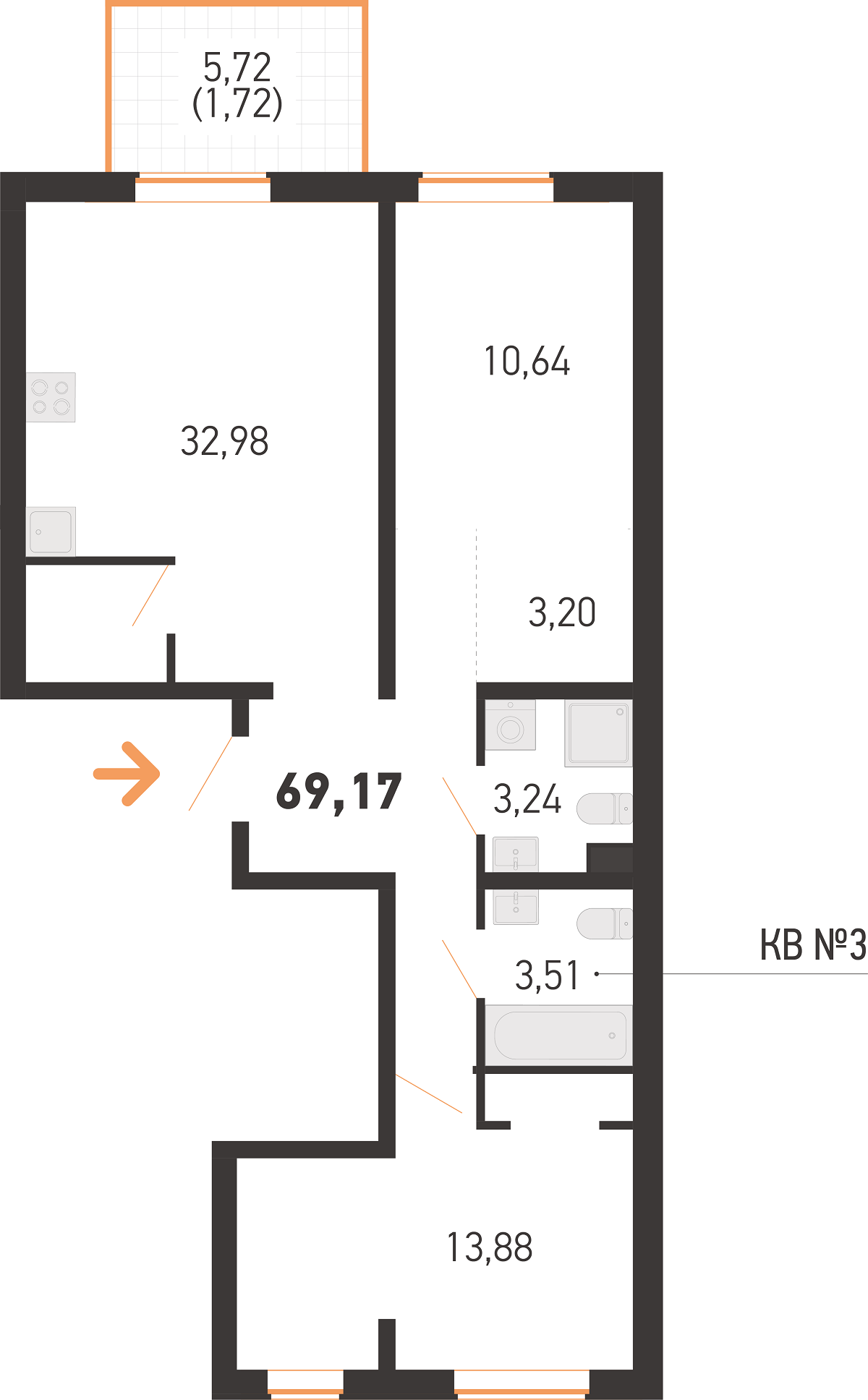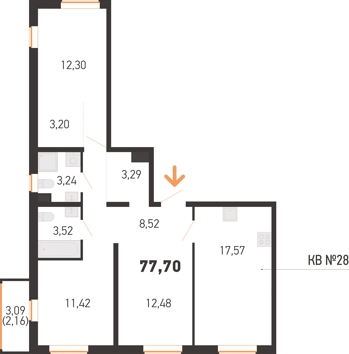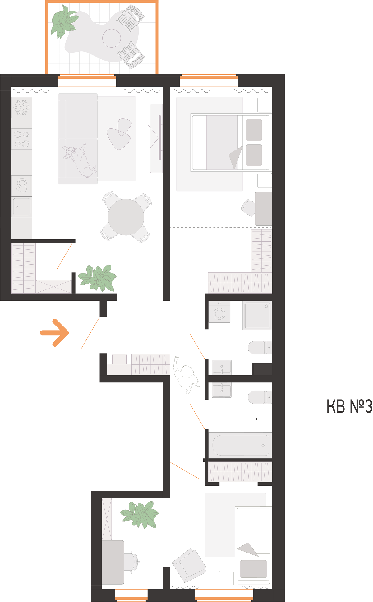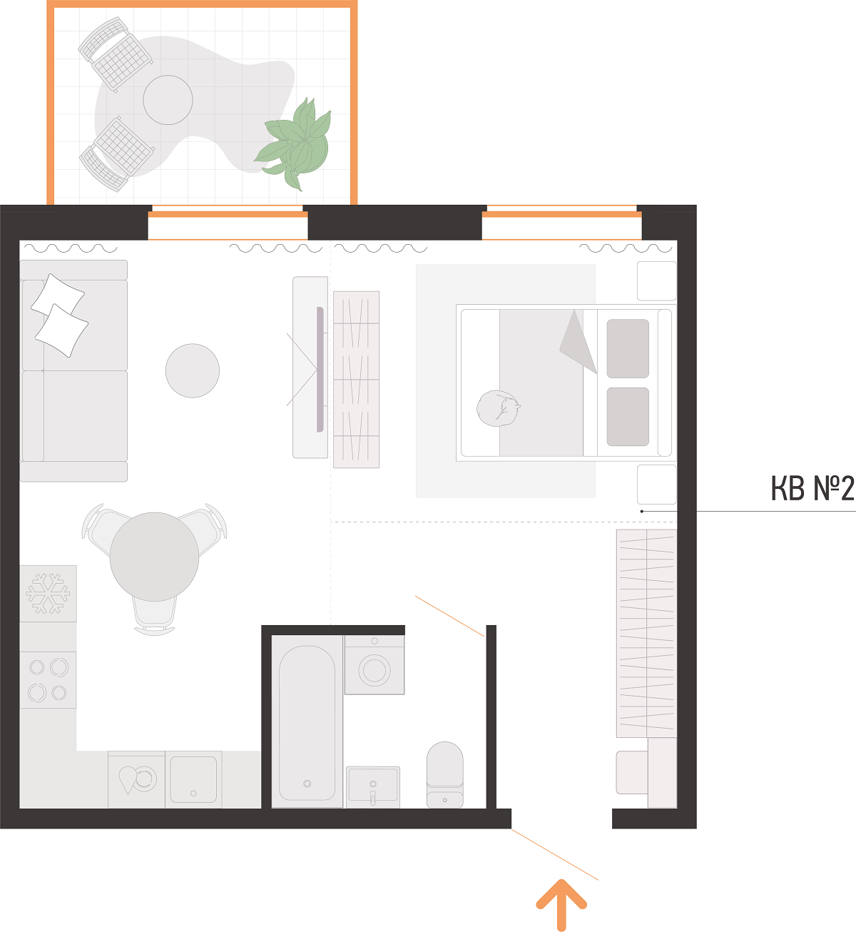 Задумка пространств такова, что даже на самой небольшой площади есть возможность организовать отдельную спальню, обустроить гостиную и кухню. Продуманная планировка исключает ненужные коридоры, но при этом позволяет грамотно организовать места для хранения.