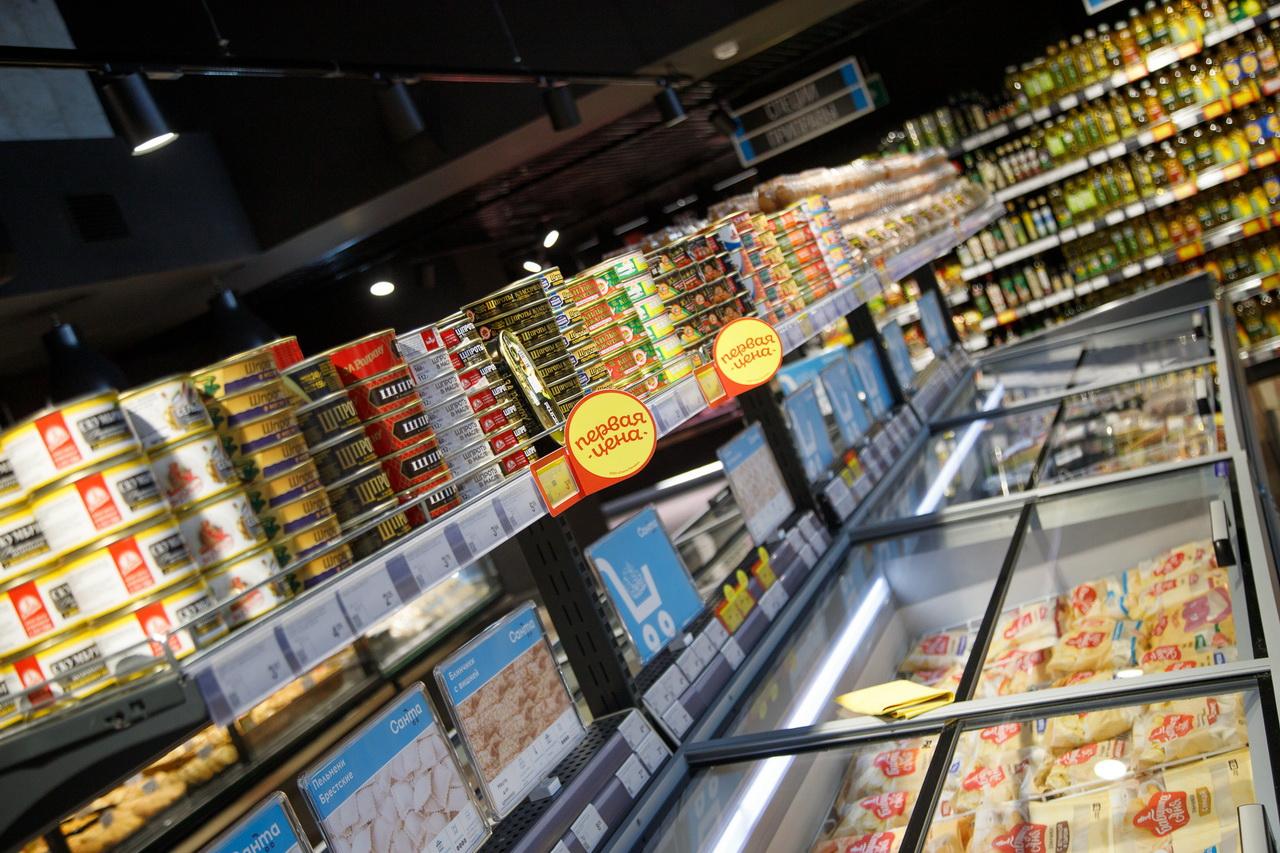 Главный акцент – доступные цены. Многие позиции отмечены красно-желтыми ценниками и продаются со скидками.