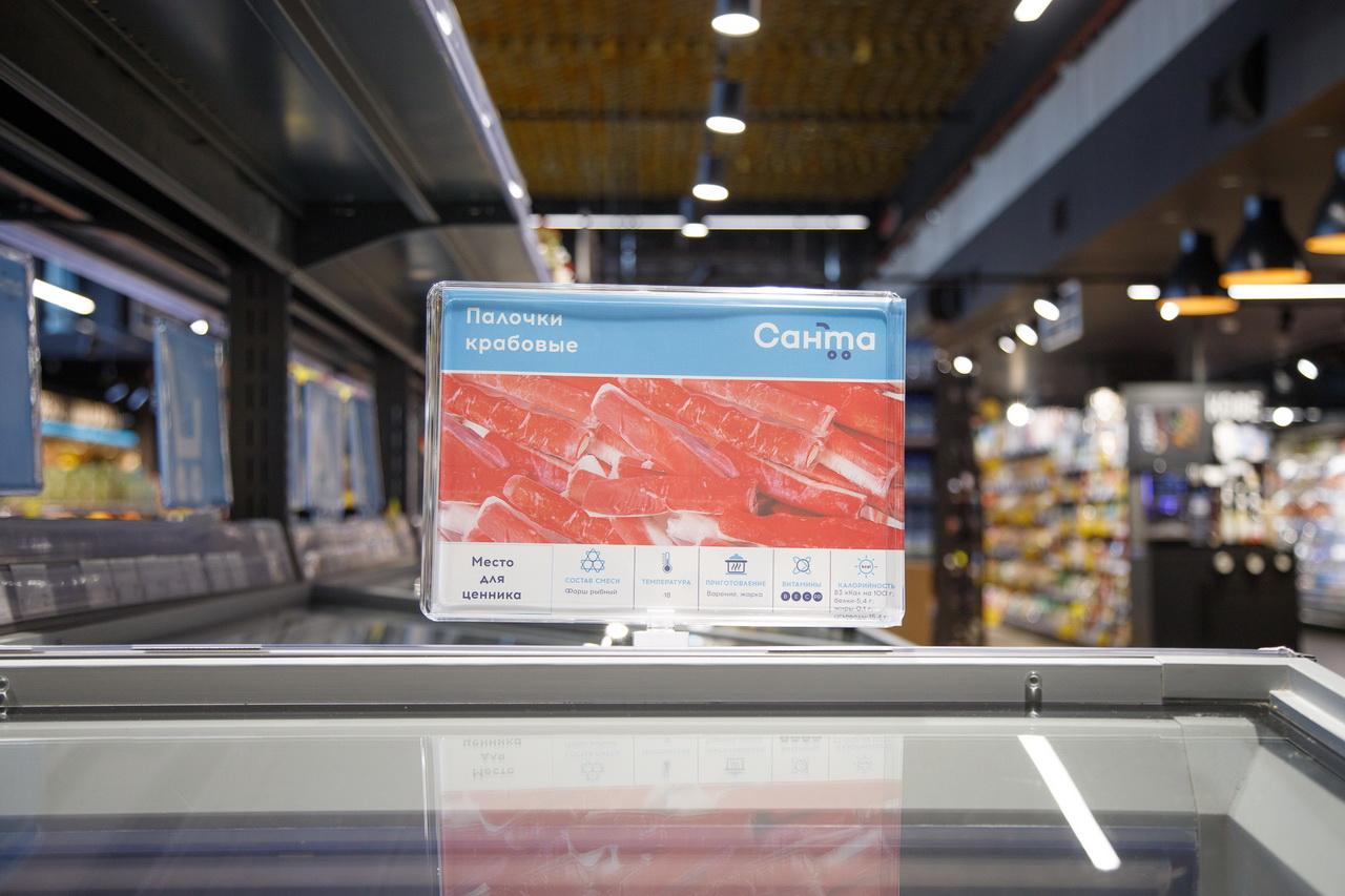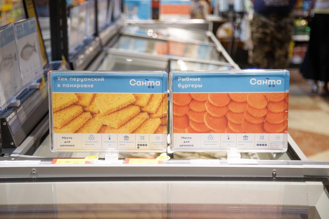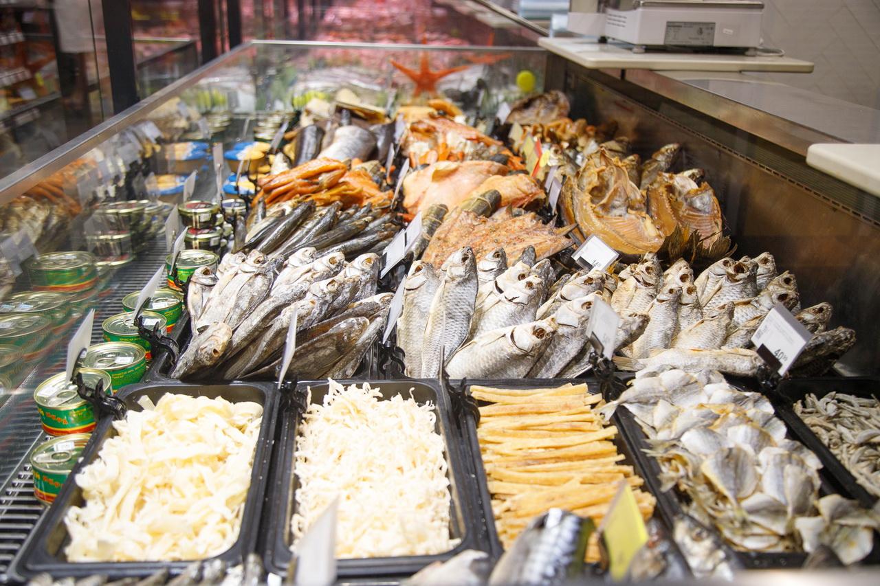 В магазине – большая фиш-витрина с охлажденной и замороженной рыбой, а также разные виды мидий и креветок. На открытии замороженные креветки покупали по 19,99 рубля за кг.