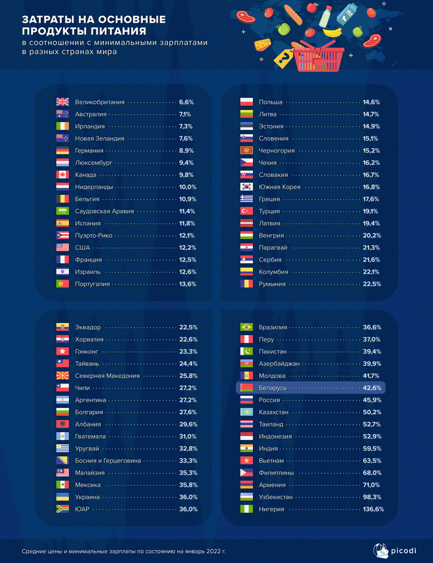Аналитики решили сравнить стоимость одних и тех же продуктов в разных странах и проверить, какой процент от официального минимального дохода пойдёт на покрытие базовой продуктовой корзины.