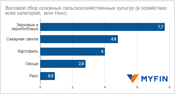 Валовой сбор зерновых и зернобобовых культур составил 7,7 млн тонн, сахарной свеклы – 4,8 млн тонн, картофеля – 4 млн тонн.