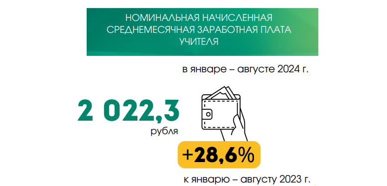 Номинальная начисленная среднемесячная заработная плата учителей в январе – августе 2024 года составила 2022,3 руб.