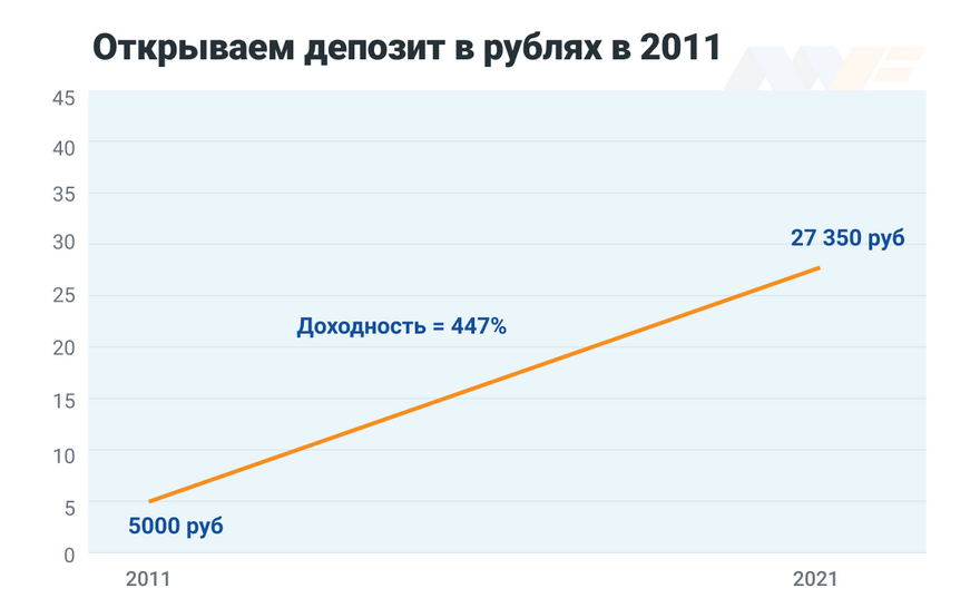 Наша доходность по вкладу составила 447% за все время или 149% с учетом рублевой инфляции за 10 лет.