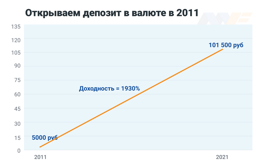 В том же 2011 году были предложения банков по открытию валютного вклада под 9% годовых на срок 10 лет. На тот момент это могло показаться довольно рискованным вложением, но посмотрим на результат. Калькулятор вкладов показывает, что $16,6 тыс, отданные в 2011-м на вклад под 9% годовых превратятся с учетом капитализации в 2021 году в $40 692. Этой суммы сегодня хватило бы на небольшую однушку в Минске. Феноменальная доходность в 145% за 10 лет в валюте. Если пересчитать эту сумму в рубли, то получится и вовсе 101,5 тыс. руб. или 1930% доходности. Даже с учетом инфляции она превышает 643%.
